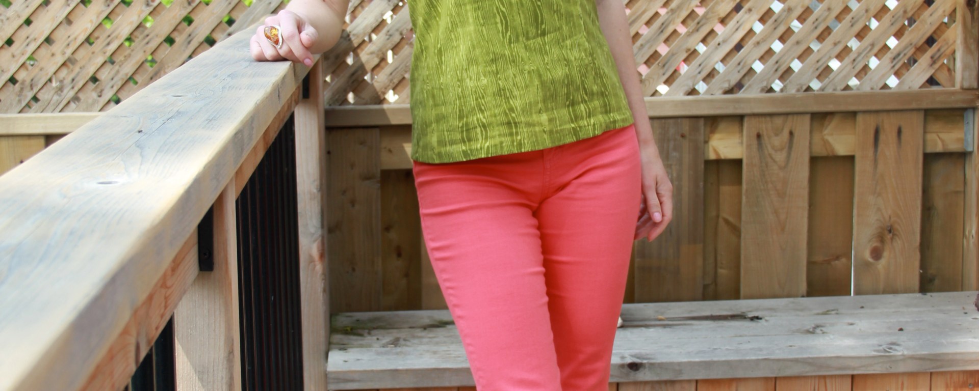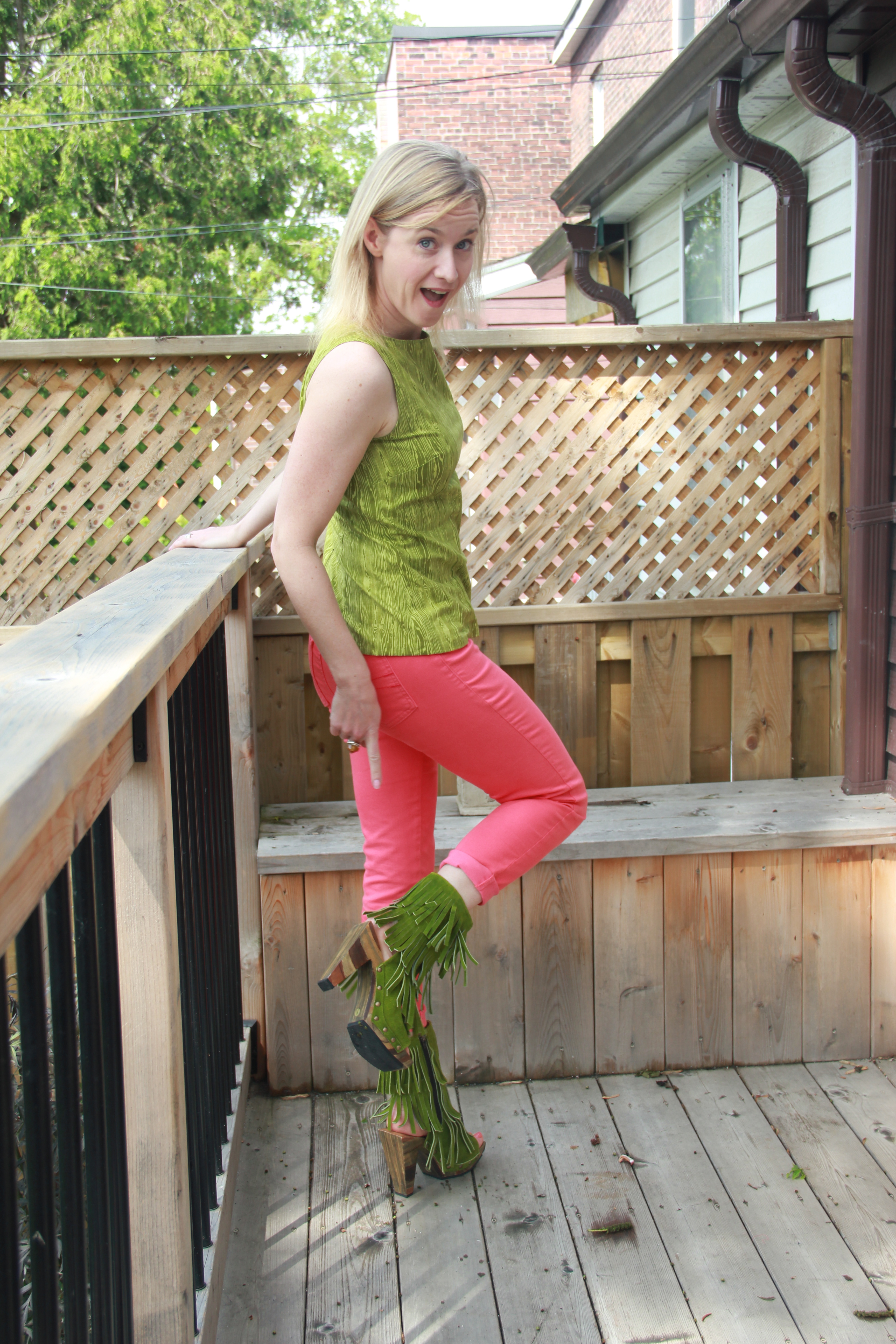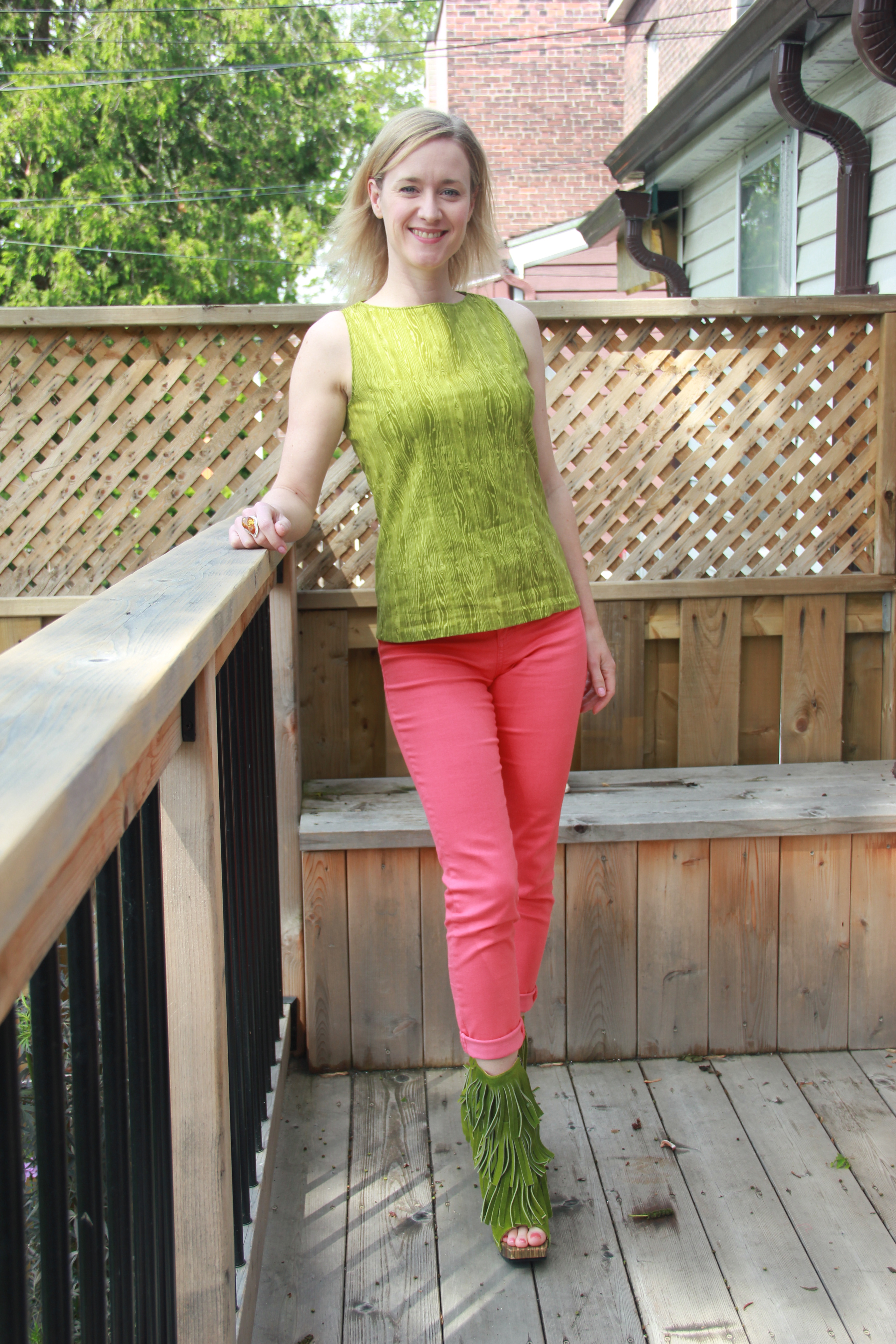 I’m sure my sister would have something to say about this outfit — she’s convinced I wear too many bright colours, and lately I hear her in the back of my head just about every time I get dressed: “you’re going to wear THAT with THAT?”. Me, I can’t get enough colour! Suddenly this year there’s colour everywhere in fashion and even in home decorating (FINALLY!–I always wanted to barf all over those photo shoots of bland, monochromatic rooms in tones of beige and cream that filled the pages of magazines for, like, the last decade at least). So what do you think? Is it possible to rock Kermit the Frog green with hot coral (or watermelon, if you prefer)?