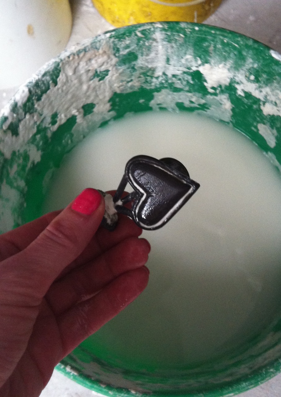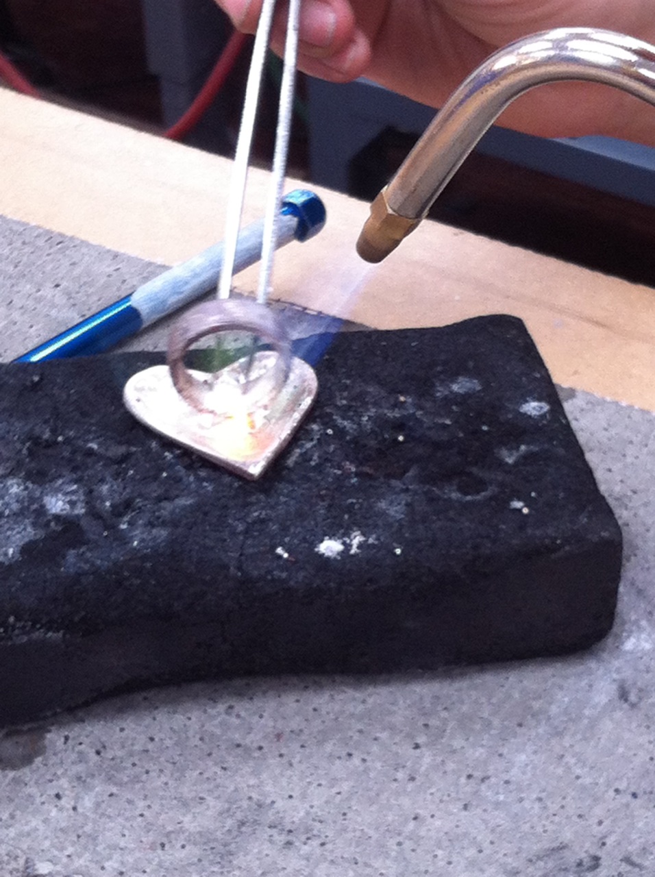 Below are the ring pieces after dissolving the plaster mold in water. It’s nerve-wracking fishing the casting out of the murky water because you are just praying that the casting process worked ok, otherwise it would be back to square one and hours of carving another wax model. You can see that both the ring band and the heart piece were done in the same mold. They’re attached by “sprues”, which are tubes that allow the molten silver to flow into the mold.