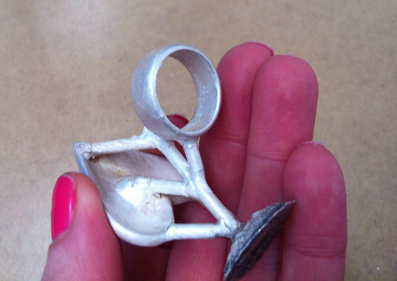 This was my final project for the jewelry casting class I’ve been taking at Jewel Envy here in Toronto. I posted previously about carving the wax model and the casting process. Here’s what happened in the last two classes.