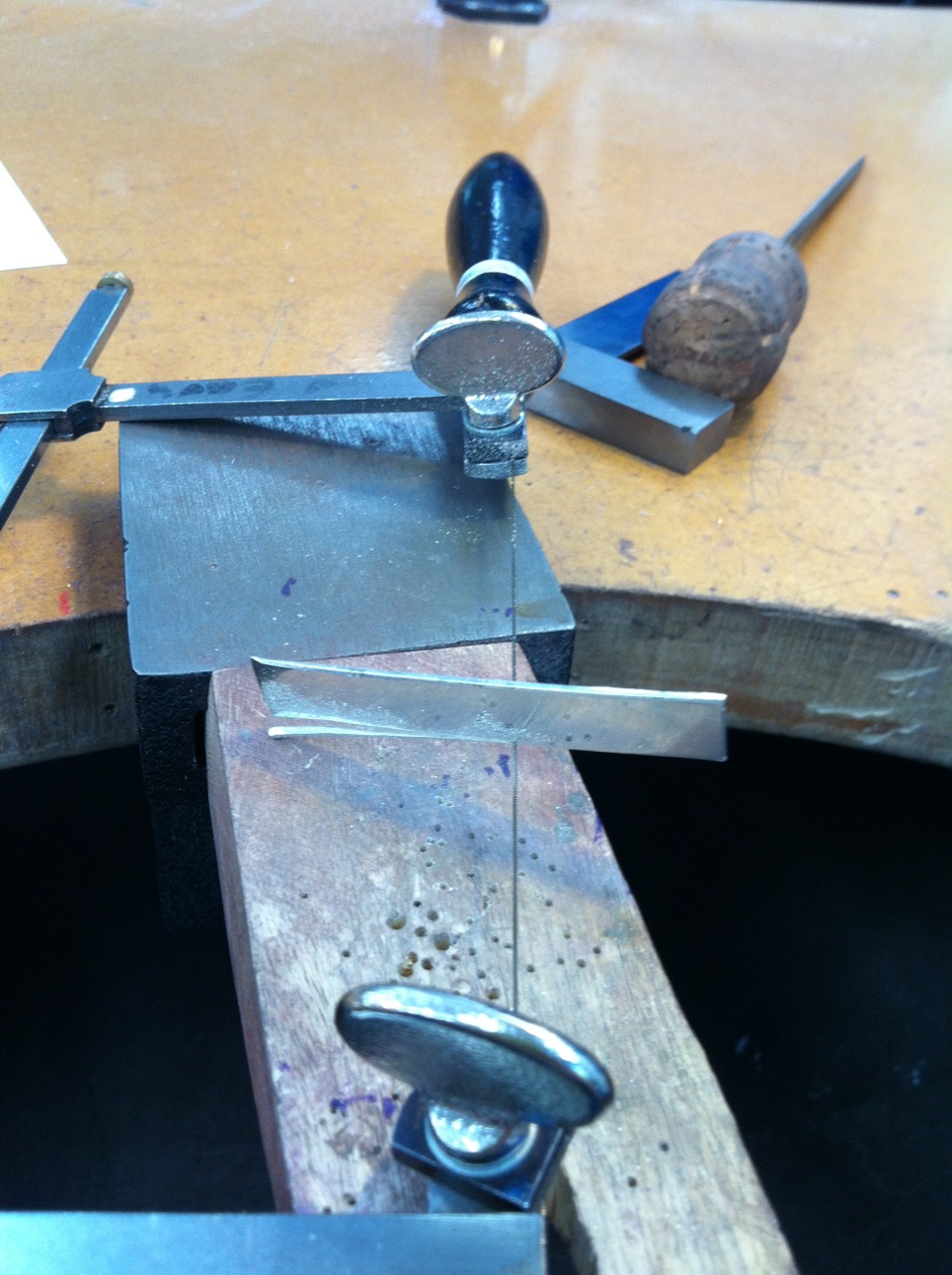 Our first project in this class was a band ring which we worked on over the course of a couple of classes. You start by determining what ring size you need to end up with and how wide you want the band to be and based on that and some math you figure out what size rectangle of silver sheet to cut. Then it’s a million years of filing to get each end of the rectangle to be an exact right angle to the long edge, so that when you bend the rectangle into a ring shape the two ends will align perfectly, which will allow you to make a seamless solder connection. Before you can bend the metal into a ring shape, you have to anneal (soften) the metal by heating it in a blowtorch flame. After it cools you can use pliers to bend it into a D-shape to make soldering the seam easier.
