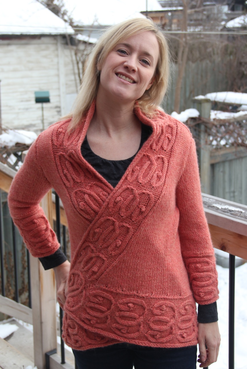 Here’s that Christmas-cum-New-Years-gift I made for my mum last year. It’s Voluta by Rachel Erin. (And of course it doesn’t fit me in these pics because I made it for my mom — still have to get a picture of her in it.) I started it on Nov. 25th but it was a bitch to knit. I ended up wrapping the completed body, sans sleeves, for my mom to open on Christmas, and gave her the completed cardigan on New Year’s. She loved it! But then again, she is my number one fan and has always loved the knits I’ve made for her, even when I was just getting into knitting and made her some pretty questionable-looking things. Yay, mom!