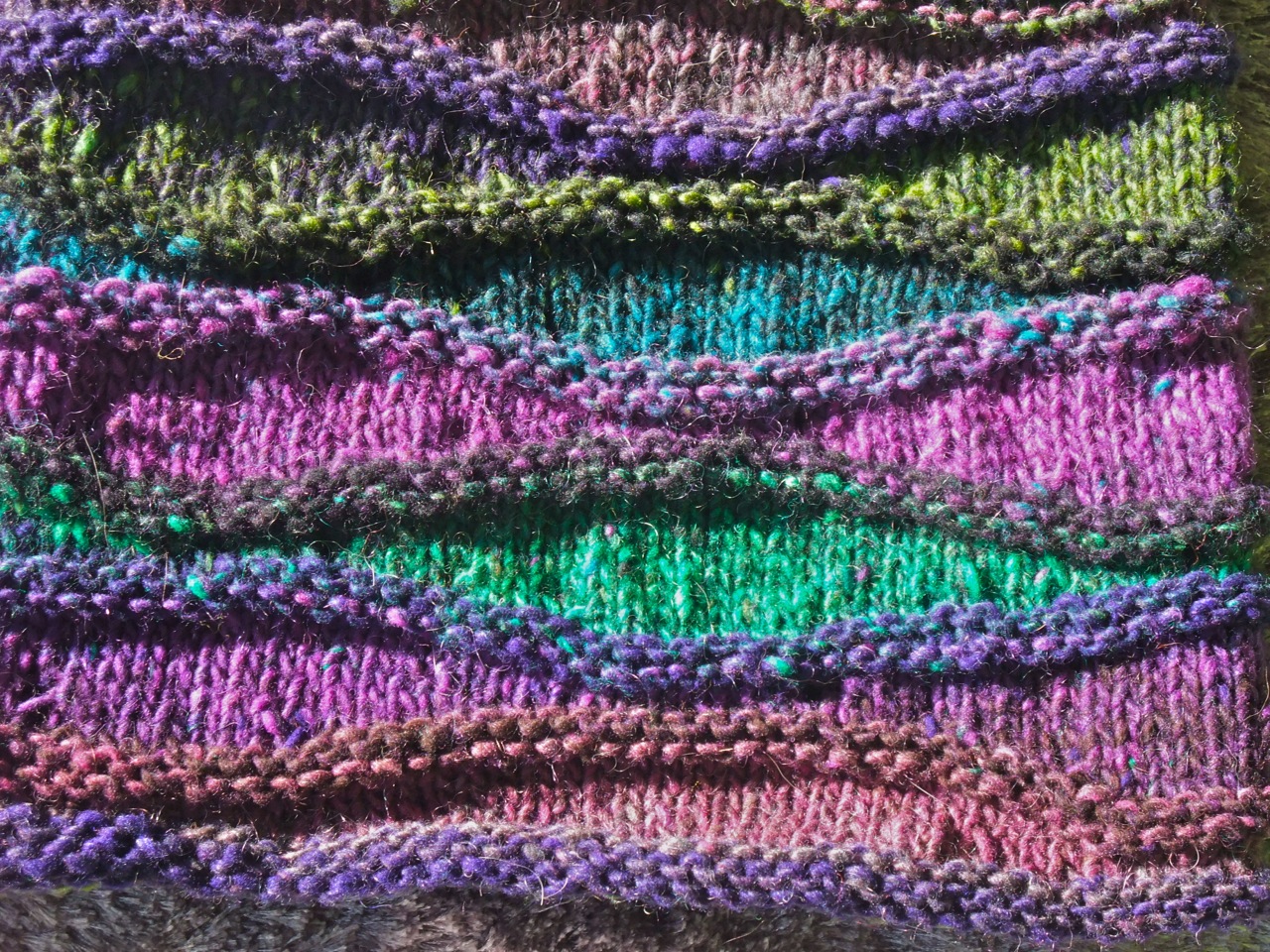 My version: Knit with 2 skeins of Noro Cashmere Island, colourway 6. I think this yarn has been discontinued but any worsted-weight Noro should do the trick. I did make modifications to the original pattern to make it slightly conical-shaped, rather than a straight-up tube.