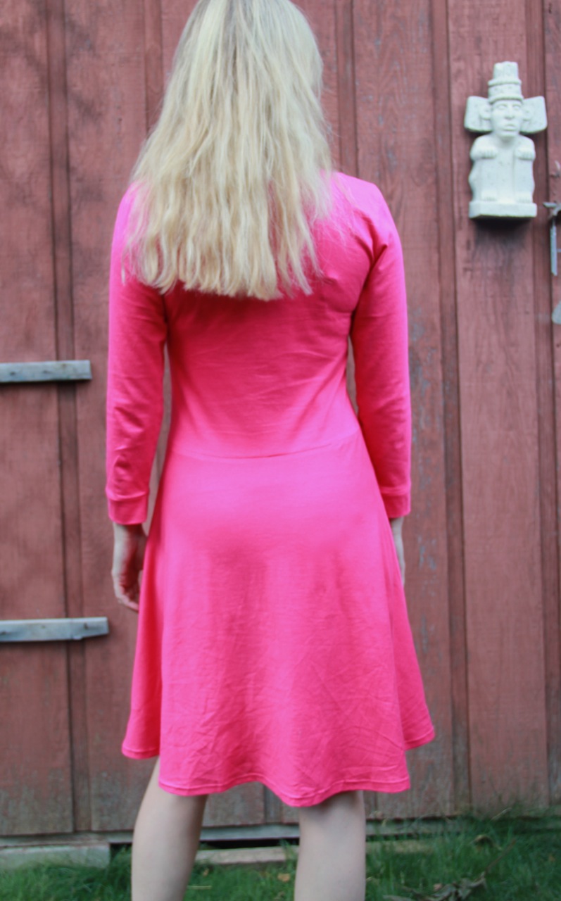The pink jersey is cotton, whereas the blue fabric is probably bamboo or rayon. I wish I could say for sure but they’re a bit laissez-faire about what the content of their fabrics are in the fashion fabric department upstairs. When you ask “do you know what this fabric is made of?”, you’re likely to get “I’m not sure” as the answer. Anyway, turns out the drape of the blue fabric is astonishingly more flattering than the drape of the pink cotton jersey — and I couldn’t even tell it was all that different by looking at it or feeling it. But the proof is in the sewing, and when this dress was stitched up (in under 4 hours, I’d like to point out!), I was fully expecting to feel like a lot of bucks like I did in the blue dress. However, blue dress = a million bucks, pink dress = maybe a hundred bucks. Disappointing.