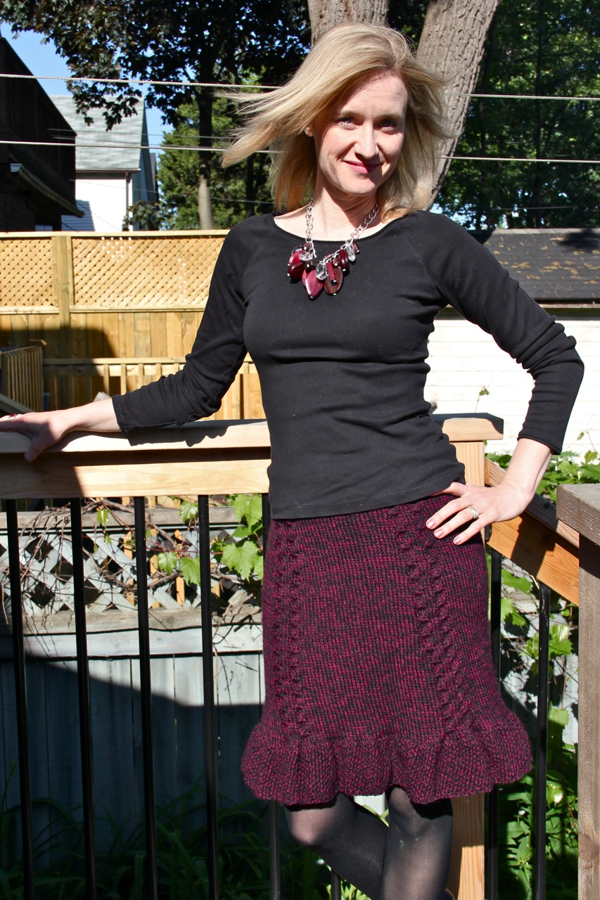 One of my favourite things to knit is a skirt. So easy: just knit a tube. Voilà. With Fall approaching, I thought I’d share with you the skirts I’ve knit, in case you’re looking for a little Fall-y skirt-y inspiration.