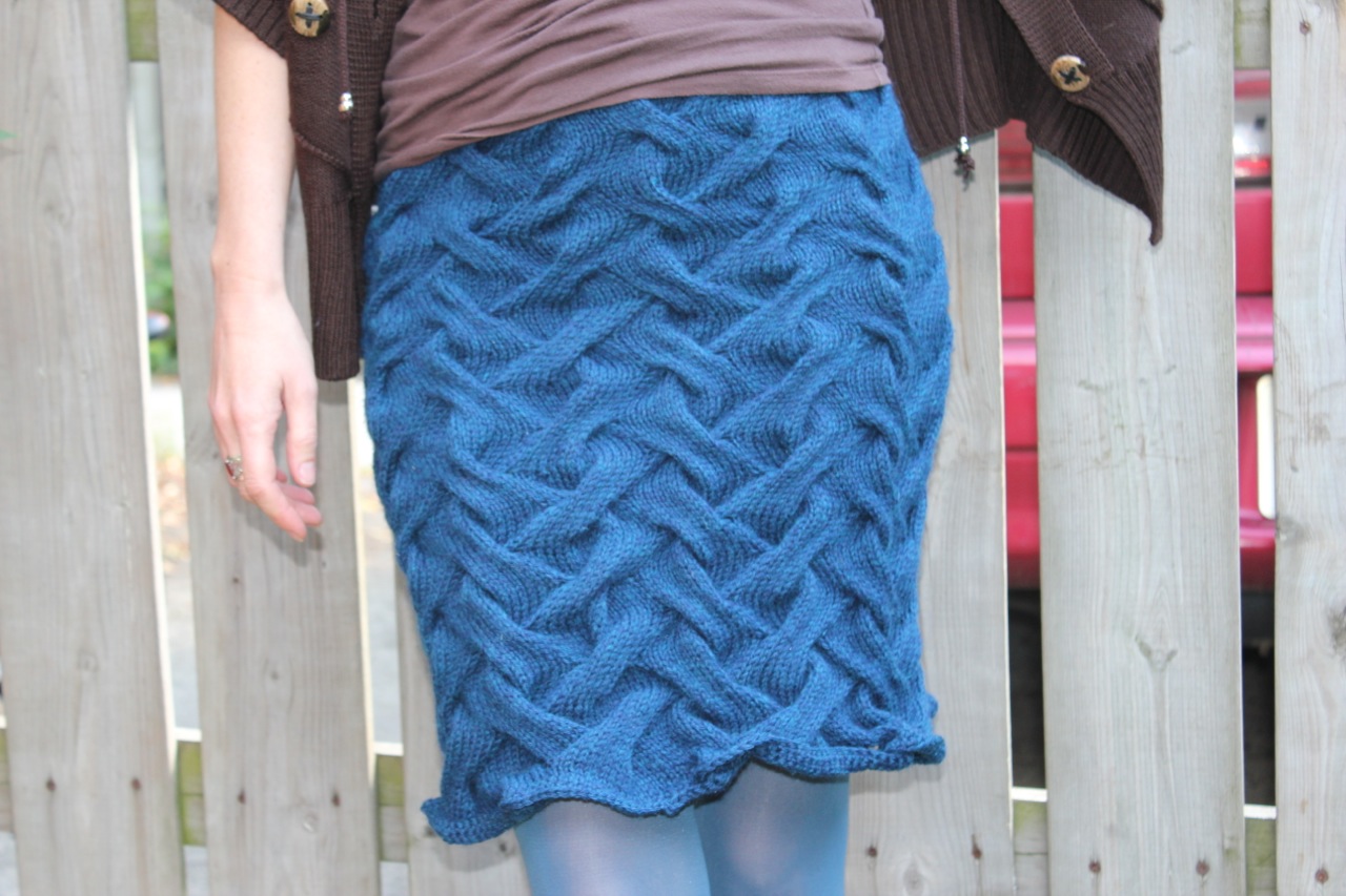 Ok, back to the skirt! A-hem! I did not block this skirt after knitting it so you can see the hem is a bit wonky. But I decided at the time when I finished it that I actually liked the way the hem came out a bit ruffly…it seemed to go with the cable pattern. Looking back now, maybe I’ll go throw that thing in some water and get that hem straightened out. I wrote about the project on Ravelry here.