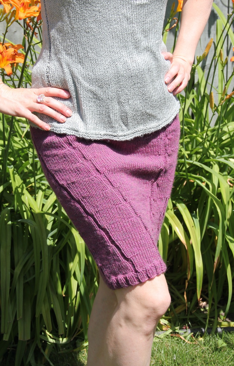 Next is my Plum Heather Skirt, based on the pattern Olive Heather Skirt by Veronik Avery.  I think the direction of the lines on this skirt makes for a flattering fit. I knit it with Cascade 220 Heathers in colour #9441 and detailed it on Ravelry here.  Speaking of stretching and sagging, I knit the tank top I’m wearing with it with 100% silk yarn. It grew quite a lot after the first washing, as you may be able to tell from its lumpy/saggy appearance in this picture. Which is why everyone always says to wash your gauge swatch, blah blah blah. And they’re RIGHT. But I still don’t wash my gauge swatches. I’m all maverick-y like that (which I’m pretty sure wasn’t a word until Sarah Palin awkwardly coined it during her VP campaign…she’s a goldmine that way).