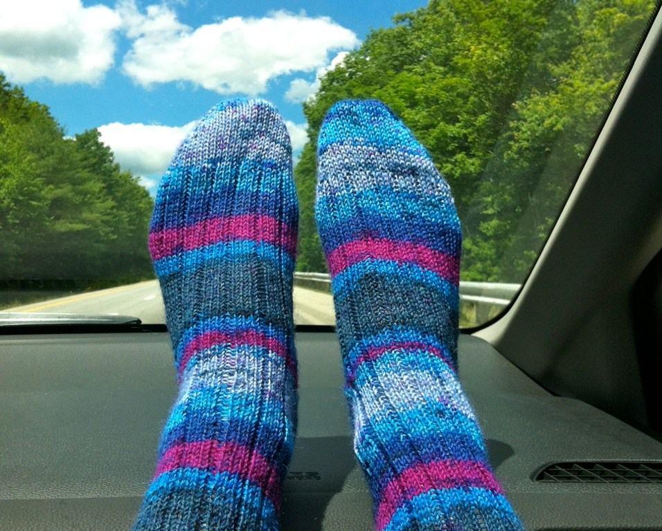 Being the first road trip we’d done in a long while, I was excited at the prospect of not having to worry about packing efficiently for a plane trip. While I did pack 7 pairs of shoes (!), which was ridiculous even for me, I did resist the momentary temptation to tote along my sewing machine. But sorry, sewing, you ain’t got nothing on knitting when it comes to traveling. So I packed up my trusty Wise Hilda’s Basic Ribbed Sock pattern, a couple of skeins of sock yarn, my metal double-pointed needles (with a weird worry as to whether they would let me cross the border with metal knitting needles, until I remembered I wasn’t going on a plane), and hit the road.
