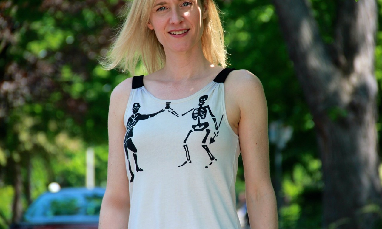 I bought the pattern while Colette was having a sale and loved making the first one so much that I went a bit crazy and made three. This green and purple one is made of cotton jersey that I purchased online from Mood Fabrics. It is so soft and drapey and I just love it. This is by far my favourite of the three tanks because the fabric feels so luxurious. I have no affiliation with Mood, but seriously, go buy some — you’ll love it. 🙂