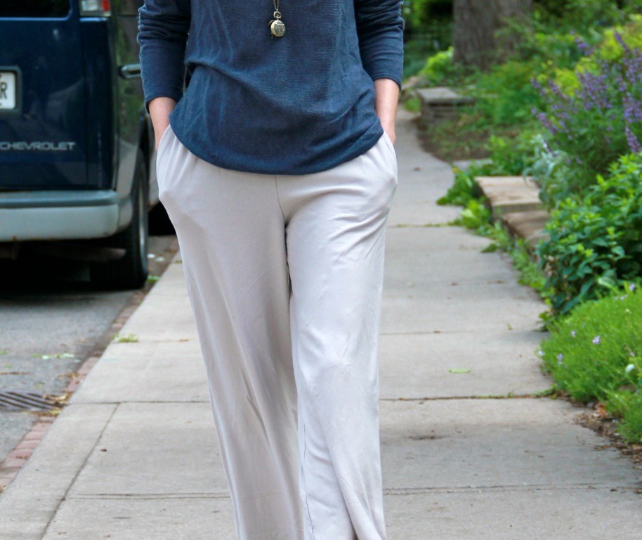 These pants are New Look 6461, a simple elasticized-waist pant that’s meant to fall a couple inches above the ankle. On my 5’4″ frame they’re a bit neither-here-nor-there in terms of length…I probably should have shortened them another inch or two. But they drape like a dream and I ADORE wearing them. In fact, I’m not even embarrassed to tell you that I wore them for two consecutive days, including to bed! [Spot the person who’s been working from home a lot lately.]