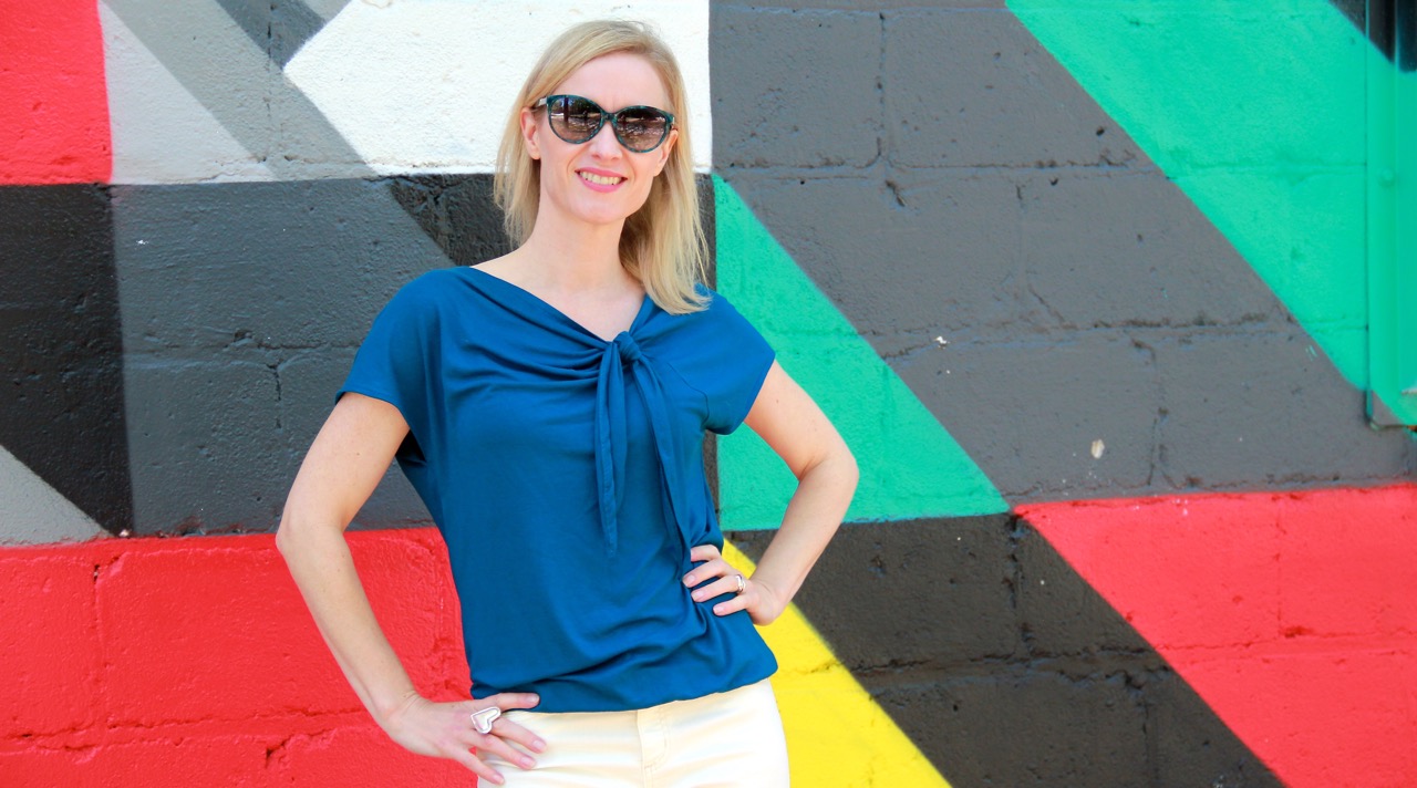 This is BurdaStyle’s Knotted Blouse from the August 2016 issue, pattern #125. I sewed it with a lightweight rayon jersey in this jeweltone teal-blue that is one of my very favourite colours.